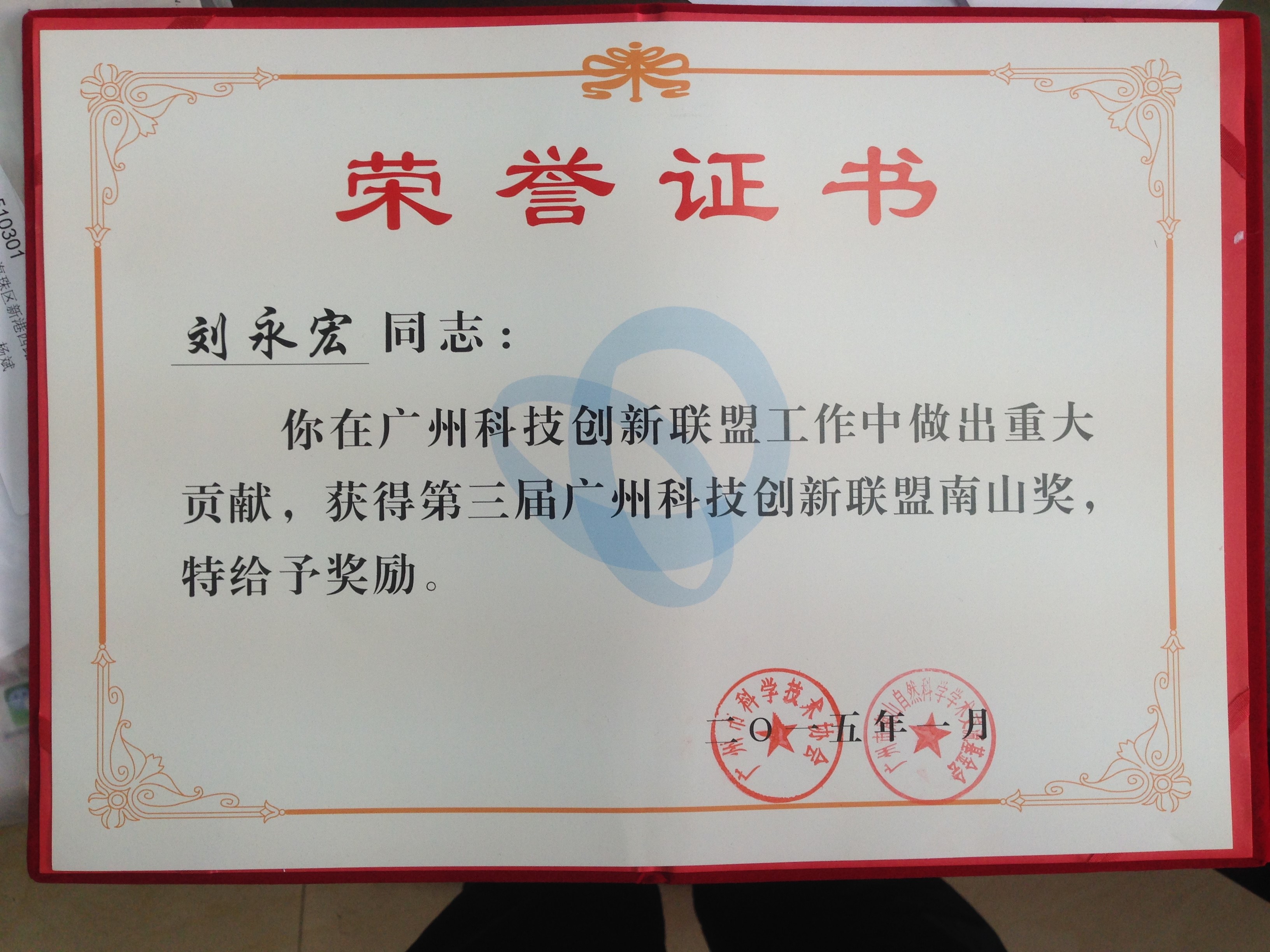 第三届广州科技创新联盟南山奖(刘永宏研究员,2014年)