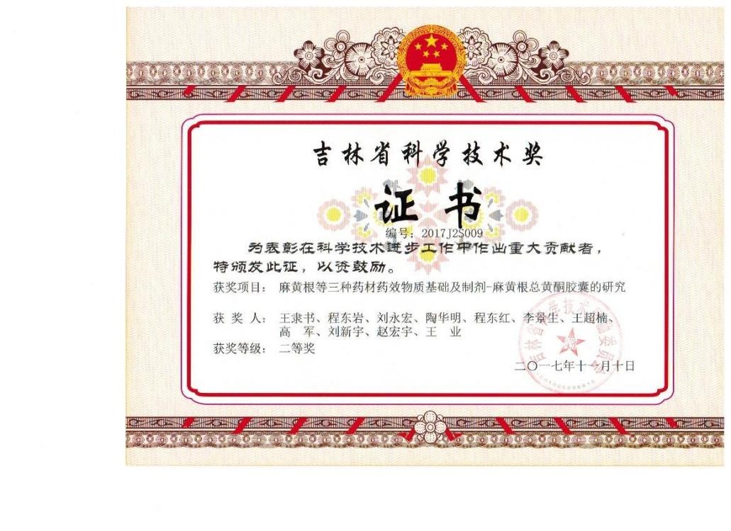 吉林省科技进步二等奖(刘永宏研究员,2017年)