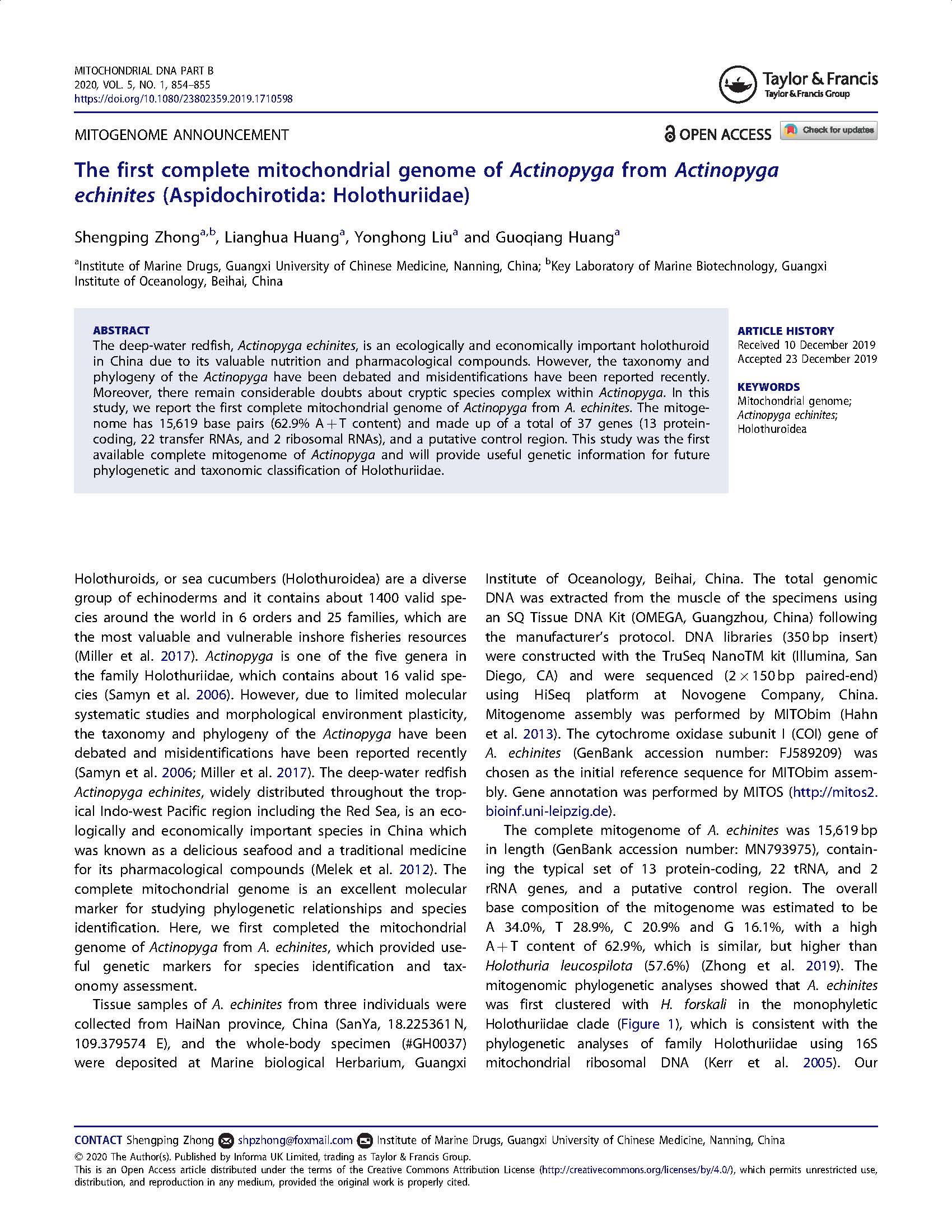 2020-The first complete mitochondrial genome of Actinopyga from Actinopyga echinites (Aspidochirotida :Holothuriidae) 发布时间:2020-10-21 16:35:06 浏览次数: 次 【字体:小 大】 分享到: 【打印正文】