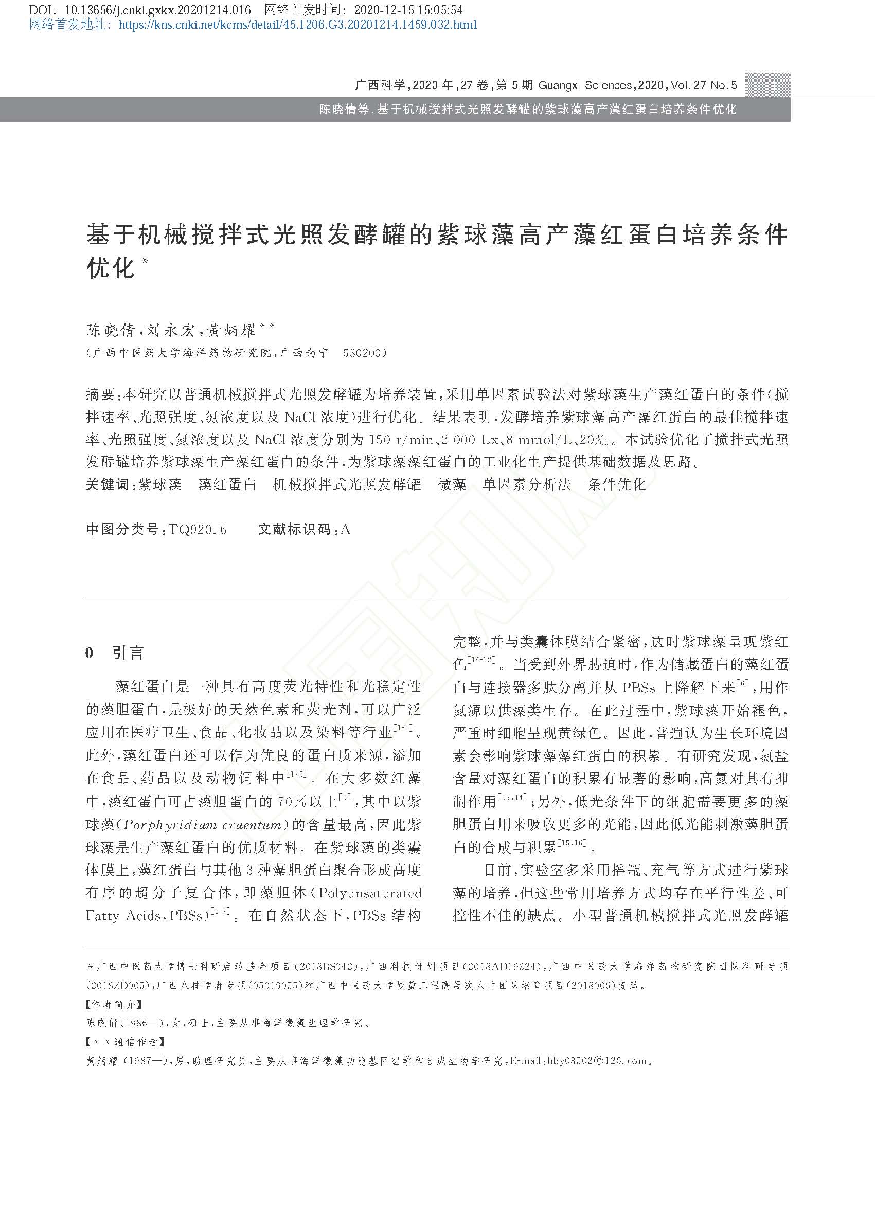 2020-基于机械搅拌式光照发酵罐的紫球藻高产藻红蛋白培养条件优化