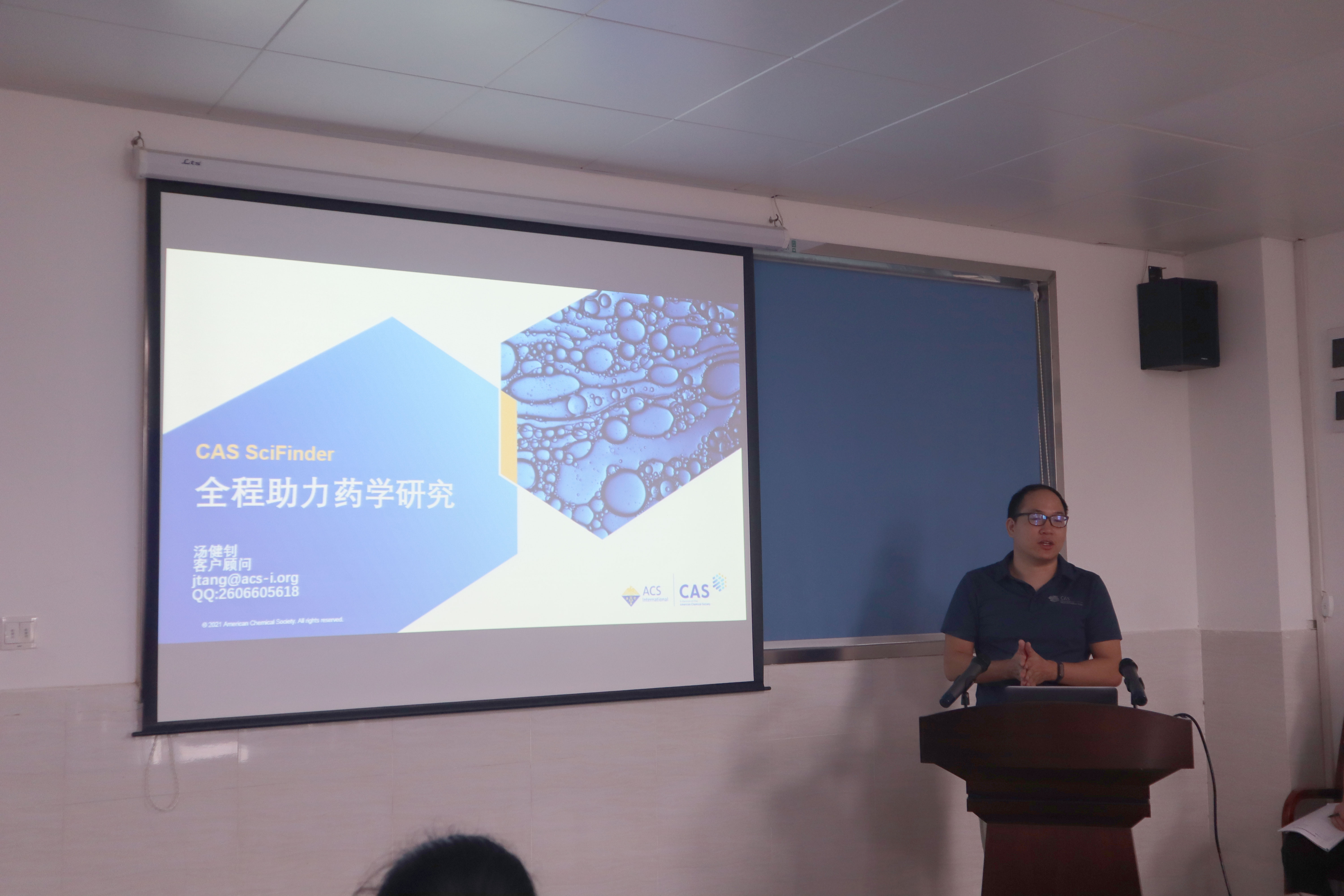 SciFinder数据库由美国化学会旗下的美国化学文摘社出品,是一个研发应用平台,提供全球最大、最权威的化学及相关学科文献、物质和反应信息。汤健钊先生着重介绍SciFinder中的文献、物质和反应检索策略及技巧,并结合大量检索案例和现场演示,充分挖掘SciFinder强大的检索功能和海量信息。现场气氛浓厚,在场师生对SciFinder数据库充满兴趣,认真聆听讲座,讲座结束后还积极与汤先生互动。