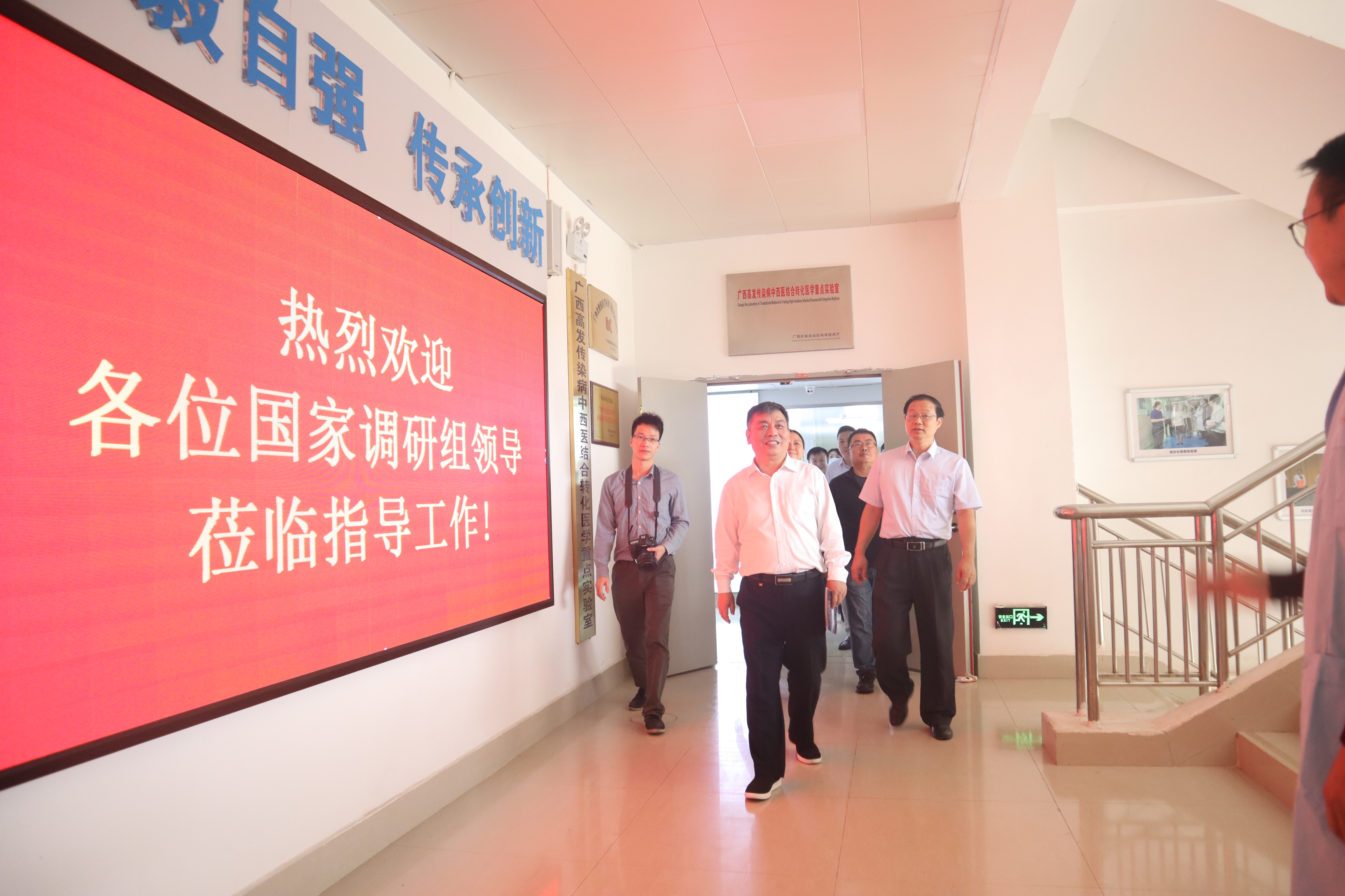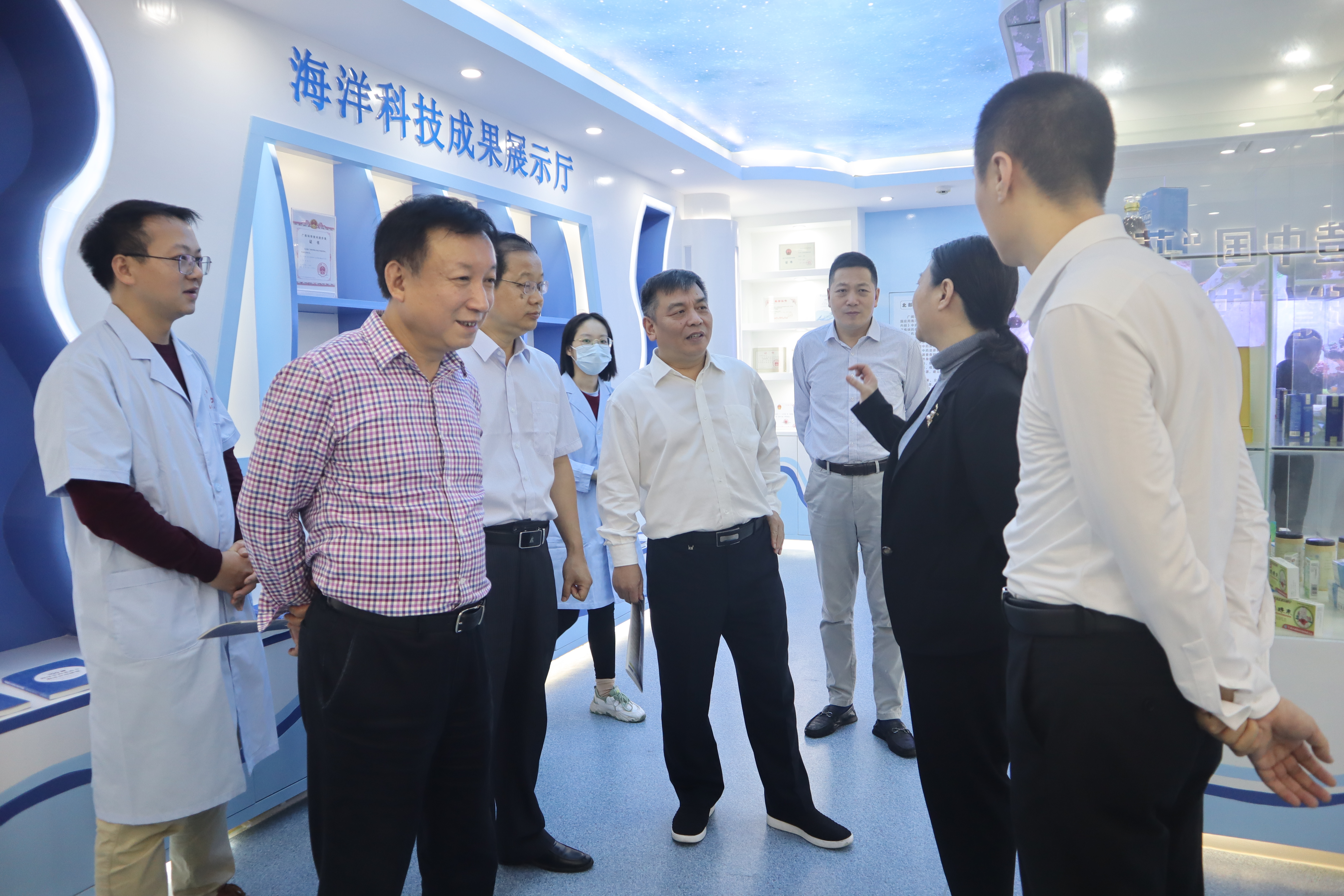 2021年10月20日,国家中医药管理局副局长闫树江一行4人到beat365官网调研。在beat365官网校长姚春、副校长戴铭,广西中医药管理局副局长范春等陪同下,闫树江一行实地走访参观海洋药物研究院科技成果展厅。