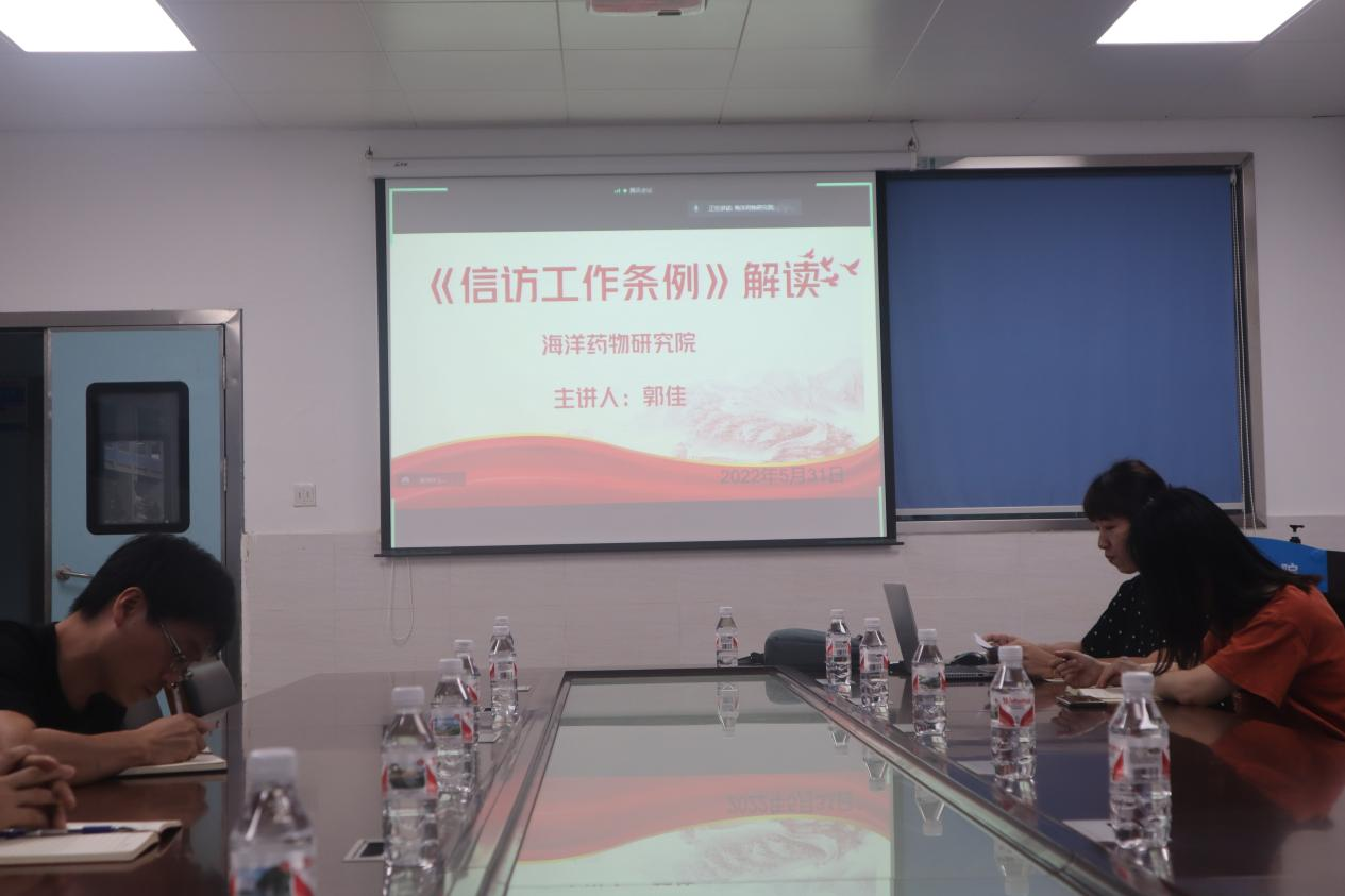 中共中央、国务院《信访工作条例》于2022年5月1日起实施,为扎实做好《信访工作条例》在beat365官网的学习宣传贯彻工作,响应学校开展《条例》宣传月活动的号召,海洋药物研究院于2022年5月31日开展了《信访工作条例解读》专题活动,由郭佳老师主讲,海洋药物研究院全体人员参加。