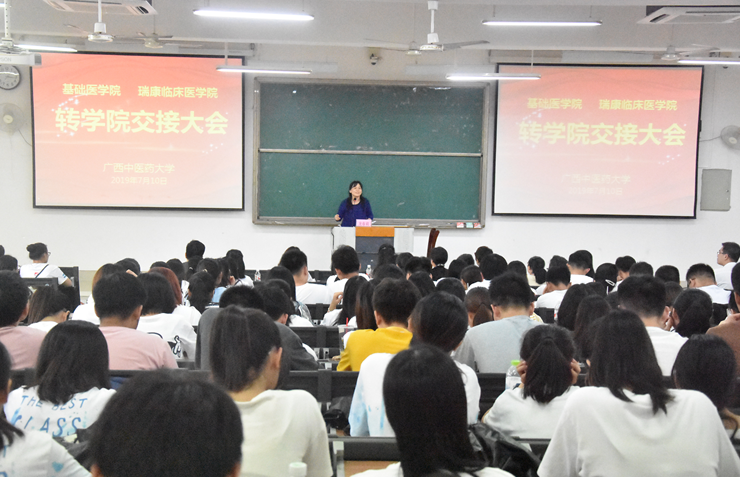 第一临床医学院钟远鸣副院长、罗之瑜书记,瑞康医学院陈日兰副院长、王瑜主任、骨伤医学院周红海院长,基础医学院龙春莉副书记、骨伤医学院田君明老师和各学院学生工作办公室、学生党总支、团委等相关老师以及全体转系的学生出席了交接大会。