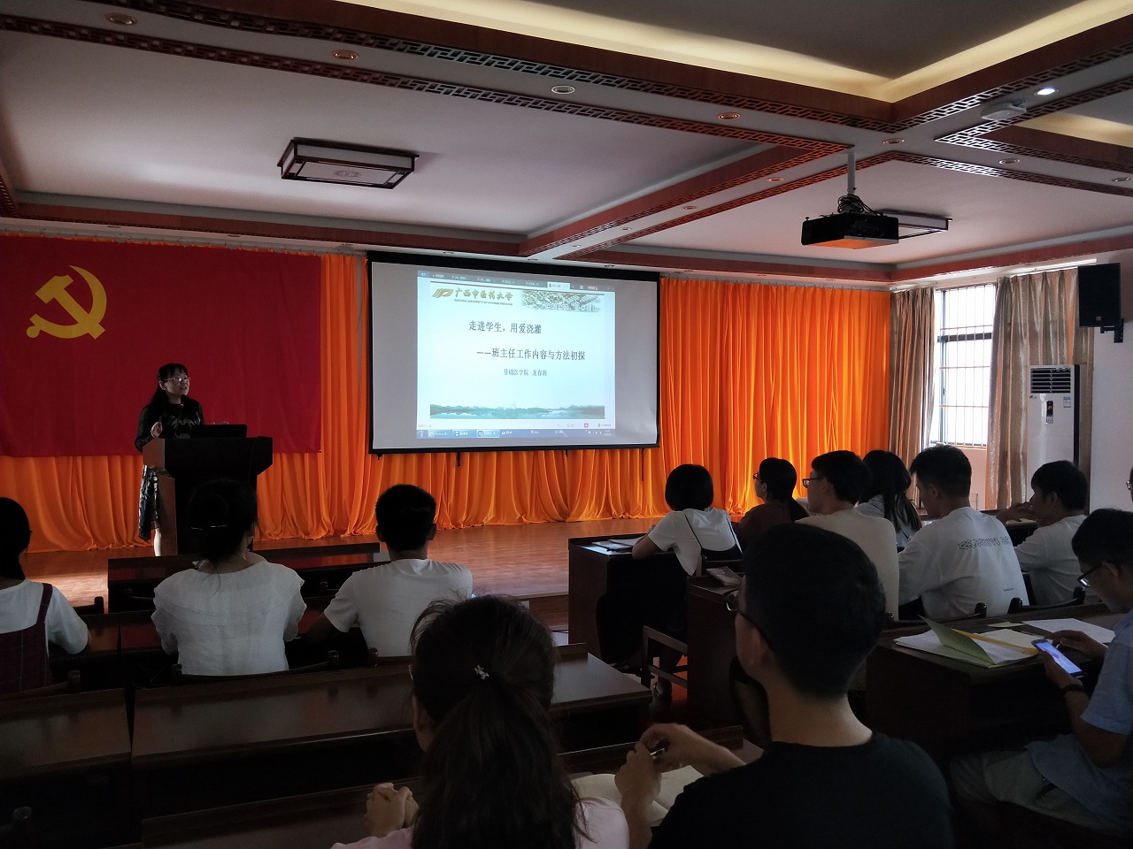 会上,龙春莉结合自己多年学生工作经验以“走进学生,用爱浇灌”为主题,详细讲解班主任工作内容与方法,希望新生班主任全心全意关注和促进学生成长、成才。