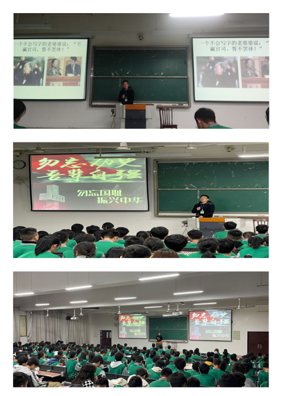 纪念大会在高唱国歌声中拉开帷幕。首先,和卫宾老师带领全体在场同学一起回顾那段人间炼狱的历史,通过大量历史图片、数据以及真实视频,全面和立体向同学们讲述那段惨痛的历史,在场同学无不被深深感染。然后,全体同学肃立,在哀曲声中低头默哀,向在南京大屠杀死难同胞和烈士致哀。随后,和卫宾老师希望每一位同学奋发图强,努力学习,勇敢责任,树立远大理想信念,牢记历史,勿忘国耻,共同为中华民族伟大复兴贡献青春力量。活动最后,全场起立,共同齐声诵读《和平宣言》,缅怀死难同胞,抒发爱国情怀,牢记历史使命,继承先烈遗志,表达珍爱和平。