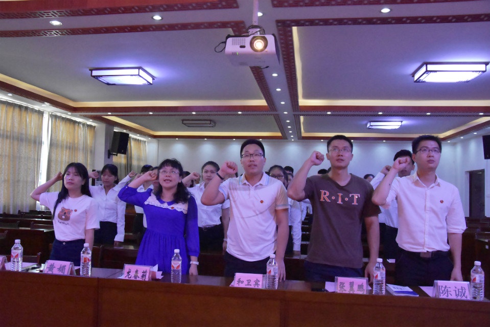 为纪念中国共产党建党97周年,表达对党的信仰以及立志为共产主义事业奋斗终身的决心,基础医学院学生党支部于6月30日下午,在仙葫校区基础院办会议室举行“七一”入党宣誓大会。基础医学院党委副书记龙春莉、基础医学院学生党支部书记和卫宾、基础医学院学生工作办公室辅导员黄媚、张翼鹏、陈诚以及预备党员及支部委员共计40余人参加本次宣誓大会