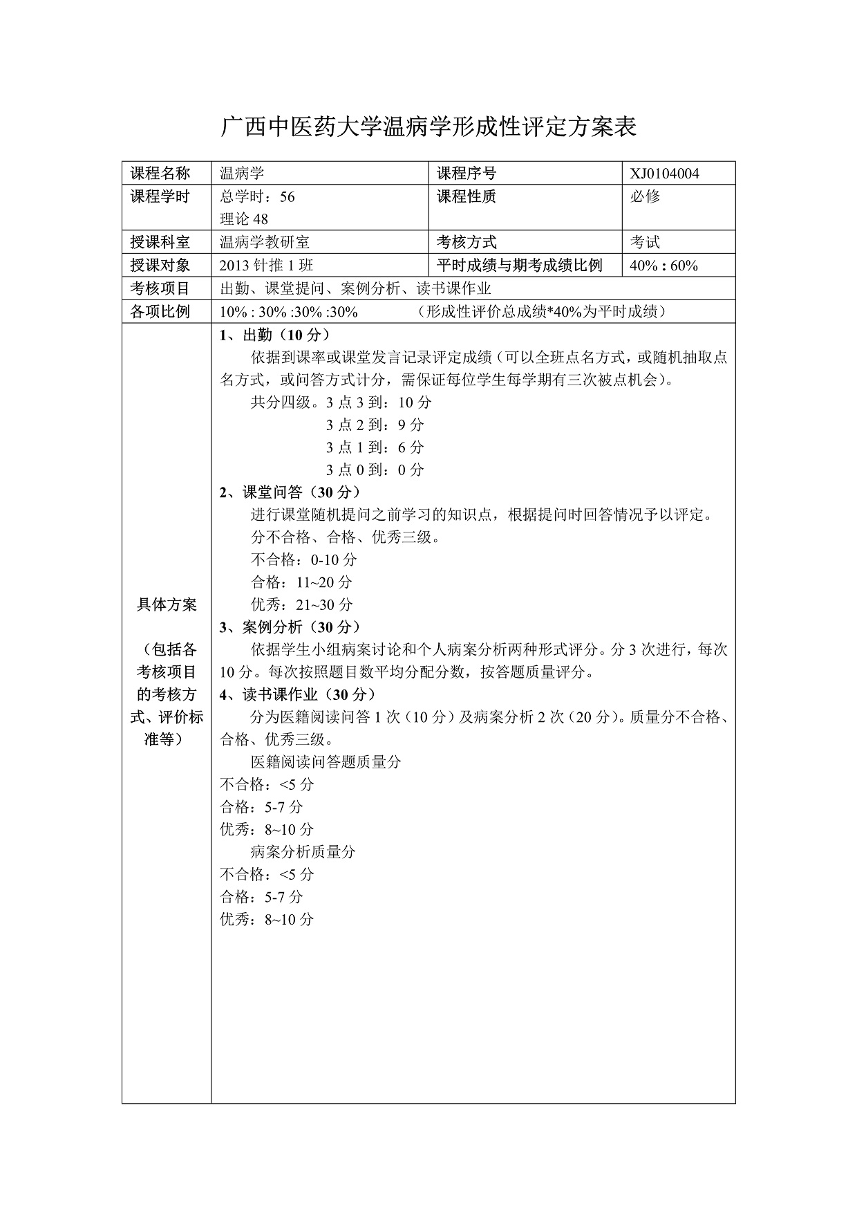 《温病学》形成性评价方案