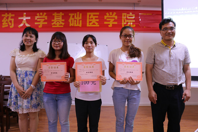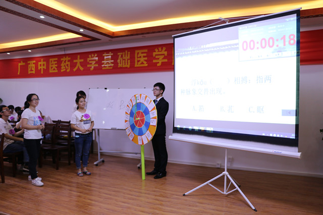 学校团委书记王春花、基础医学院院长林江、学工处副处长罗晓燕、学校教务处副处长韦维、基础医学院党委副书记龙春莉、学校党委宣传部理论科科长张国琳等领导、老师莅临决赛场地进行现场指导,本次大赛还有幸邀请到基础医学院医古文教研室主任周祖亮和学校语委办副主任、学校普通话培训测试站副站长、医古文教研室陈晓林老师担任评委。整个决赛分三个环节竞逐,分别为“争分夺秒”、“头脑风暴”和“谁与争锋”。来自学校不同学院的34名优秀选手组成五个小队进行角逐,分别有“杏林使者”、“白虎队”、“路路通”、“艾叶队”和“远志队”。在整个比赛过程中,“谁与争锋”环节更显激烈,利用转盘选出选手进行两两pk,优胜者可继续进行下一轮的角逐,而留在场上的最后一位选手即为本次大赛的状元。经过层层比拼,最后2013级中医学专业的孙伟平同学摘得“拼写状元”桂冠,2014中医学专业的岑艳芳等两名同学获得“拼写榜眼”称号,李雪珺等三名同学为“拼写探花”,曾丽莉等四名同学被评为“拼写秀才”,“最佳团体奖”根据全场表现最终花落“杏林使者”队。大赛最后,评委周祖亮老师对本次大赛进行了点评。他充分肯定了参赛选手的表现,也希望通过此次比赛可以提高同学们在中医药用字方面的认读、拼写能力和水平,期待今后在类似的比赛中同学们能有更加精彩的表现。