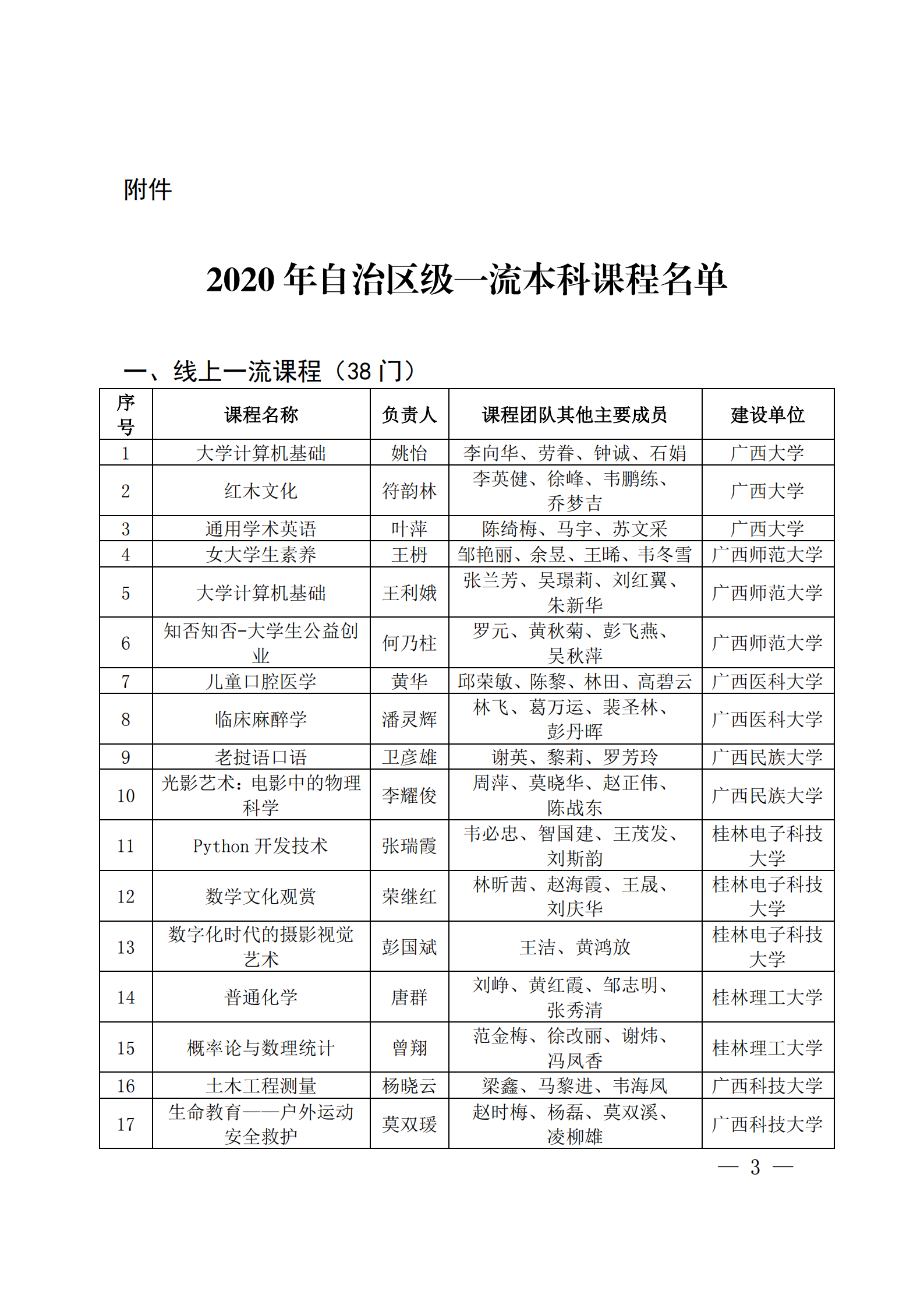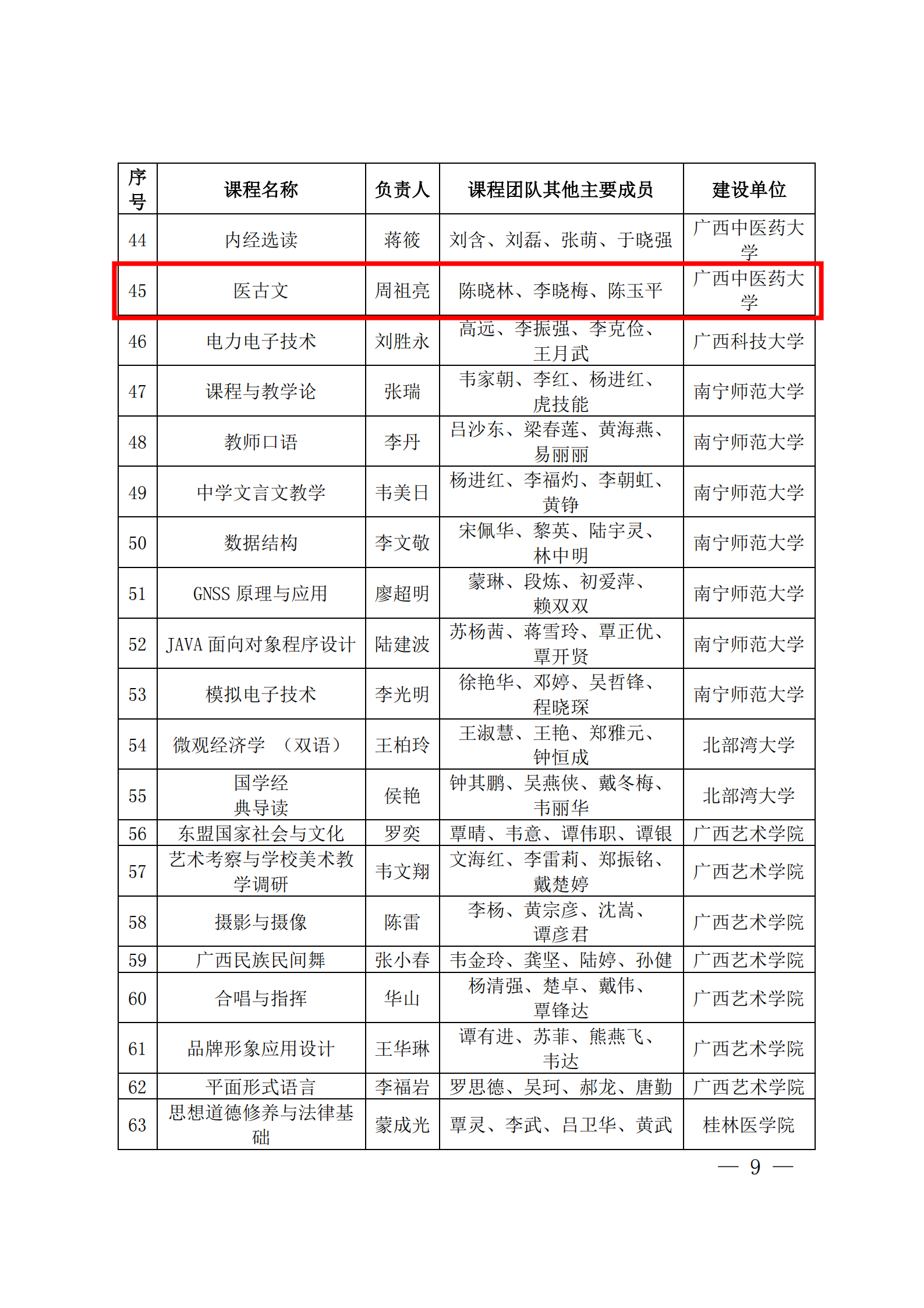 《医古文》课程获评自治区级一流本科线下课程 来源:本站原创 作者:医古文教研室 发布时间:2021-12-07 15:25:25 浏览次数: 次 【字体:小 大】 根据《广西高校一流本科课程建设三年行动实施方案(2019-2021)》(桂教高教[2020]3号)和自治区教育厅关于开展2020年自治区级一流本科课程认定工作的安排,经高校推荐、专家评议、自治区教育厅审核,认定302门课程为2020年自治区级一流本科课程。其中我教研室《医古文》课程被认定为线下一流课程。自治区教育厅关于公布自治区级一流本科课程名单的通知及附件(扫描件) 分享到: 【打印正文】