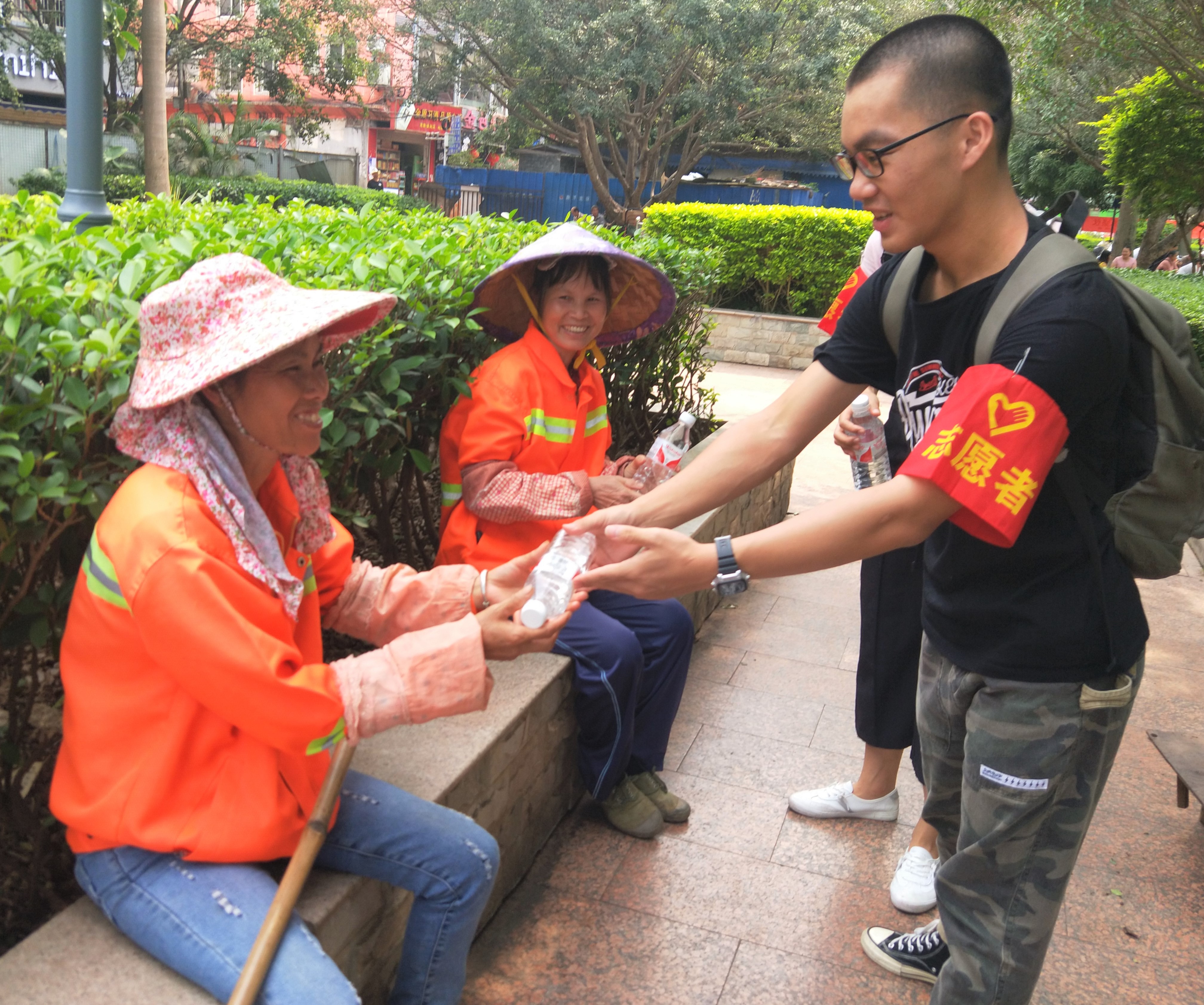 为增加活动影响力,让更多人感受到青春正能量,本次活动在仙葫管委会、beat365正版唯一入口必一仙葫校区、新兴广场、海茵国际花城、仙葫农贸市场五个地点同时开展。活动期间,基础医学院团委、学生会志愿者们怀着极大热情,冒着炎热天气,走向大街小巷,寻找辛勤劳作的环卫工人,通过慰问送水、深情交谈、赠送创可贴等形式让他们感受到了社会的温暖,感受到社会关注,感受新时代大学生的热情。