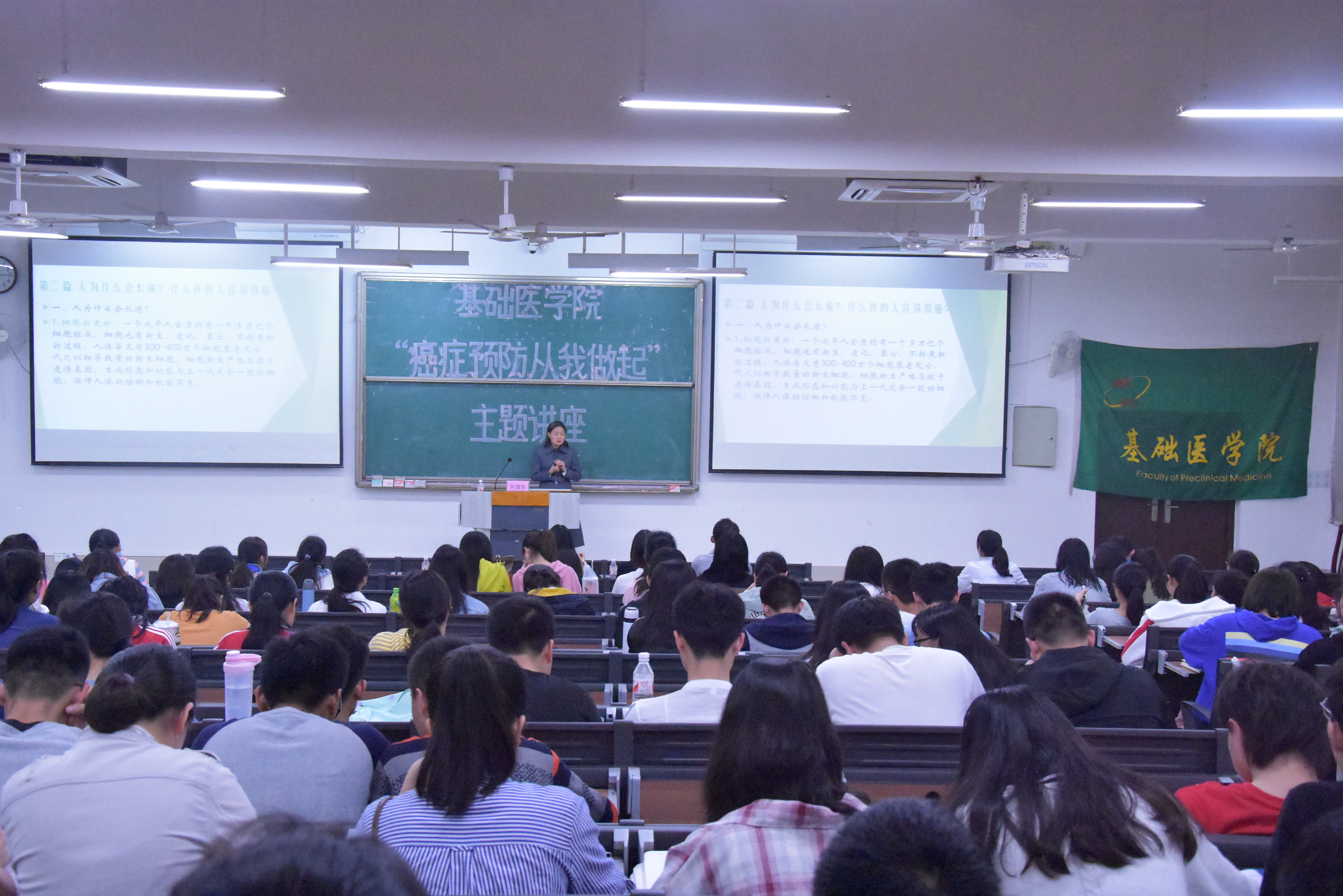 为给我院学生搭建更加丰富第二课堂学习平台,促进我院学风建设,增进大学生与优秀博士之间的沟通交流,基础医学院特开办“博士讲堂,每月一讲”活动。3月29日晚在教学楼1栋201教室,“博士讲堂”之何国珍博士讲《癌症预防从我做起》,基础医学院300多名学生参加本次讲座。