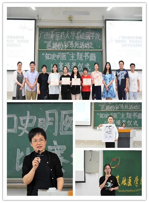 本次书画比赛分为初赛、决赛两个部分,初赛共收到作品60多幅,经过初审,20多幅作品进入决赛,进入决赛的优秀书画作品采取线上、线下投票及老师打分三种方式评比,根据综合得分决出比赛名次。5月20日晚在仙葫校区教学楼1-301教室举办了本次书画比赛颁奖仪式。中医文史与各家学说教研室主任莫清莲副教授、公共卫生与管理学院传统文化与艺术教研室庞邦君老师、中医文史与各家学说教研室王缙老师、李晓梅老师以及学办和卫宾老师、康浩老师、张忠斌老师参加本次活动。莫清莲老师为活动致辞,她指出中国医学史是打开中医世界大门的钥匙,希望同学们可以多多学习中国医学史,继承和发展好深厚的中医药文化。然后获奖同学依次上台分享了作品背后的创作灵感,讲述了他们与医药的故事情缘,或是有感于古代医家对苍生黎民的悲悯仁慈;或是有感于巾帼不让须眉的古代女医家。通过语言和图画的交互,获奖者的灵感和构思形象地呈现在观众们的眼前,令众人叹服。同时颁奖仪式期间穿插播放了有关党史的视频并针对视频内容和有关中国医学史的内容进行现场提问和抢答,气氛一度热烈。