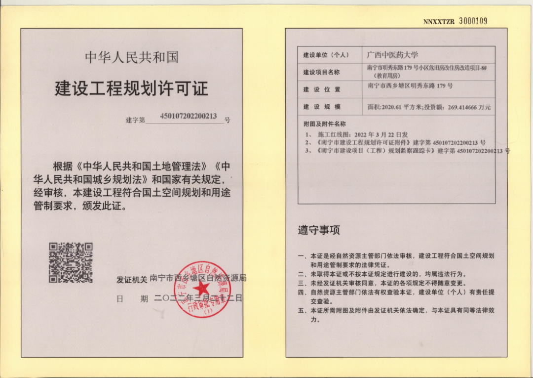 根据项目推进进度及上级主管部门审批要求,2022年1月,beat365官网向南宁市自然资源局递交办理项目回建教育用房建设工程规划许可证申请。经自然资源局审批,项目向自然资源局交纳城市基础设施配套费,并于近日办理取得《建设工程规划许可证》。