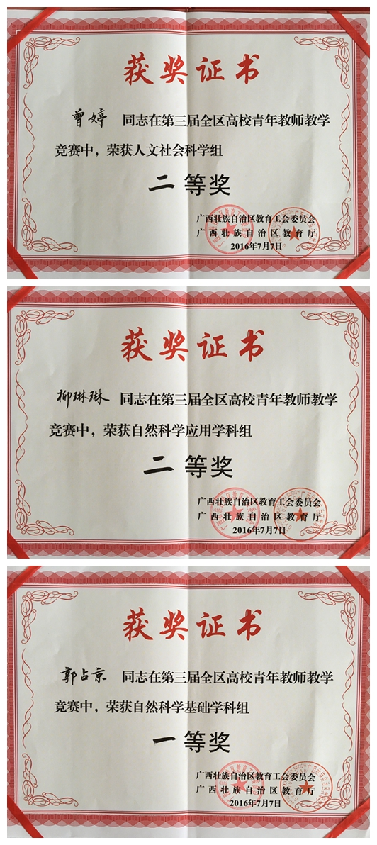 7月6日~7日,第三届全区高校青年教师教学竞赛在广西师范大学举行,来自全区34所本科院校(含独立学院)的89名青年教师参加了此次大赛。beat365官网选派了三名在校级教学基本功比赛中成绩优异的选手参加了比赛,分别为药学院郭占京老师、护理学院柳琳琳老师、人文社科学院曾婷老师。三名选手在比赛中发挥稳定,勇夺佳绩,其中郭占京老师荣获自然科学基础学科组一等奖,柳琳琳老师荣获自然科学应用学科组二等奖,曾婷老师荣获人文社会科学组二等奖。