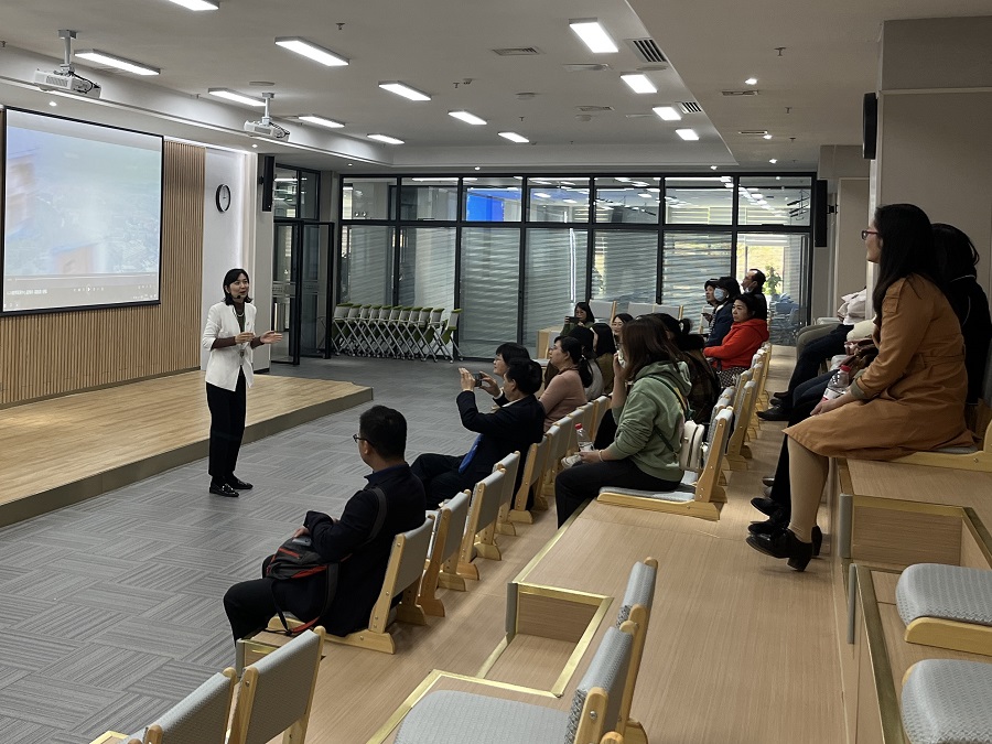 朱珠向广西农业职业技术大学来访团详细介绍了教师教学发展中心的组织机构、人员配置、工作职能及取得成效,并陪同参观了1415m2教师教学发展中心新场地,就场地的功能分区、设计意图及场地赋能教育教学工作的重要作用与来访人员进行了深入沟通。