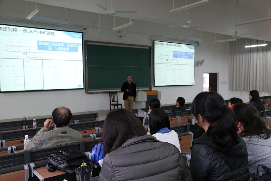 ProQuest培训及咨询顾问王剑飞老师则做了题为《定位ProQuest 平台, 获取全球医学研究信息》的讲座。他通过比较LWW与PHMC介绍PHMC的资源优势,Medline、PubMed与PubMed Central 三者的关系;论文写作与研究中ProQuest平台上信息价值的简要分析:从PHMC资源角度进行选题、各类型文献在研究中的利用等;信息定位中的专业数据检索的策略由泛而精、准确定位、按需获取,研究跟踪等思路;以及如何获取信息和管理信息等。