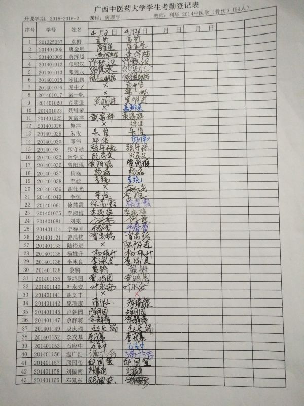 1、考勤:安排四次理论课下课进行前5分钟,点到的学生依次离开教室,做到出勤考核公平、公正、真实,考核学生学习态度。每月进行一次,时间随机。请假同学应按学校规定进行申请,提前上交请假条。选其中2次计入平时成绩,占期评成绩10%。