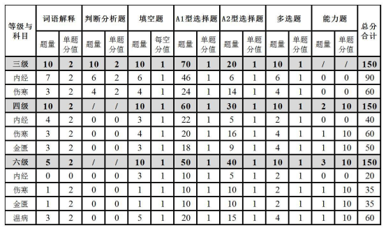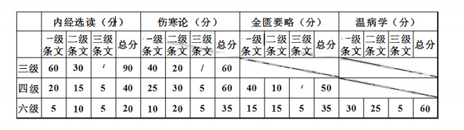 1.考试范围:三级涉及《黄帝内经》、《伤寒论》两个科目,主要考察一级条文;四级涉及《黄帝内经》、《伤寒论》、《金匮要略》三个科目,以一级和二级条文为主;六级考察《黄帝内经》、《伤寒论》、《金匮要略》、《温病学》四个科目,一、二、三级条文均会涉及。各等级学科及各级条文所占分值详见表1。