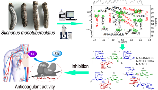 赵龙岩团队采用上述解聚方法制备及解析了具有重要经济价值的花刺参(Stichopus monotuberculatus)来源多糖及寡糖组分结构,发现其可能存在特殊二糖侧链,解聚过程中可能发生去皮反应。药理活性研究发现,制备的花刺参解聚产物及其寡糖片段可选择性抑制内源性因子X酶,并表现出强效的抗凝血活性,特殊的二糖侧链和新颖的还原末端可能增强抗凝活性。该发现可为海参多糖解聚产物在抗凝药物的开发和利用提供重要参考信息。