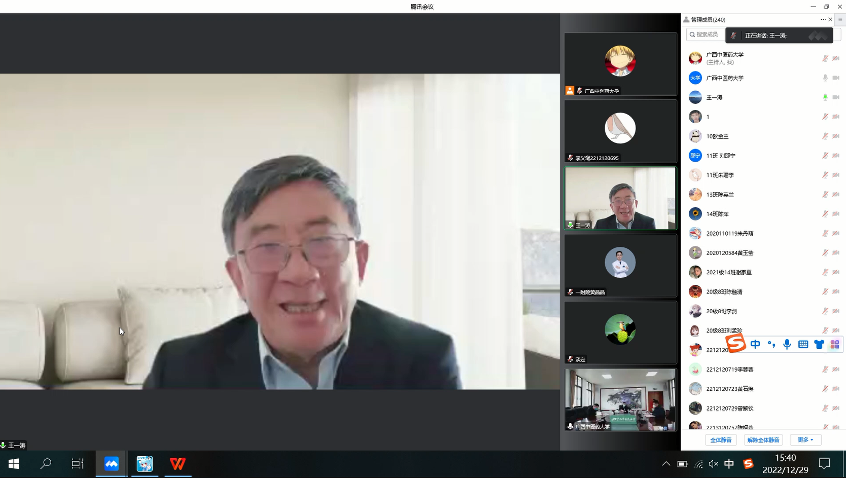 12月29日下午,beat365官网举办2022年中医药传承创新学术讲座。会议采取线上与线下结合的方式,特邀澳门大学讲座教授、澳门中药研发中心主任王一涛教授主讲。学校党委书记莫锦荣,副校长冷静出席会议。学校党委办公室、科技处、各二级单位、教辅部门共1100余名师生通过线上或线下参会。会议由冷静主持。