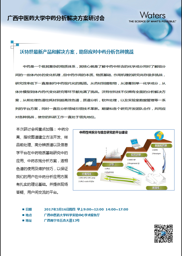讲座内容: 中药分离、指纹图谱建立方法开发、样品前处理、高分辨质谱以及信息学平台在中药物质基础研究中的应用、中药农残分析方案,液相色谱的使用及维护技巧,以保证我们的用户在中药分析应用方面有扎实的理论基础。并提供现场答疑、用户间交流的平台。