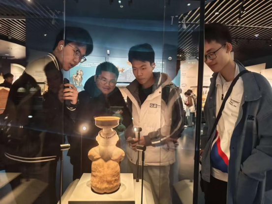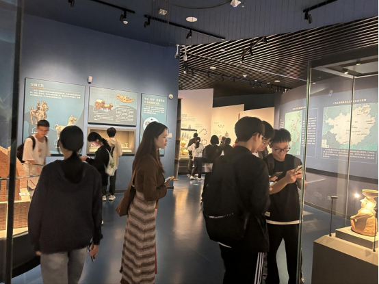 依托自治区博物馆丰富馆藏,两门课程教学团队重点引导学生参观“合浦启航—广西汉代海上丝绸之路”展厅与广西古代文明陈列展厅。在海上丝绸之路展厅,学生通过琉璃、琥珀等外贸文物及船舶模型,直观感受古代商贸中的开拓精神与文明互鉴;以医药交流遗迹为切入点,探究和谐、敬业、诚信等传统价值观对中医药传承与国际化发展的基础作用。在古代文明展厅,羽纹铜凤灯、翔鹭纹铜鼓等镇馆之宝及民族融合相关文物,让学生领略广西多民族交往交融历程,深化了对中医药在民族交流中重要作用的认知,接受了铸牢中华民族共同体意识的生动教育。