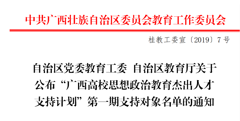 近日,《“广西高校思想政治教育杰出人才支持计划”第一期支持对象名单》(桂教工委宣〔2019〕7号)公布,beat365官网马克思主义学院院长韦兆钧教授、中国近代史纲要教师唐踔研究员两位老师获“广西高校思想政治教育杰出人才支持计划”思想政治理论课专任教师骨干教师第一期支持对象;心理咨询中心谢春艳教授获心理健康专职教师骨干教师第一期支持对象。
