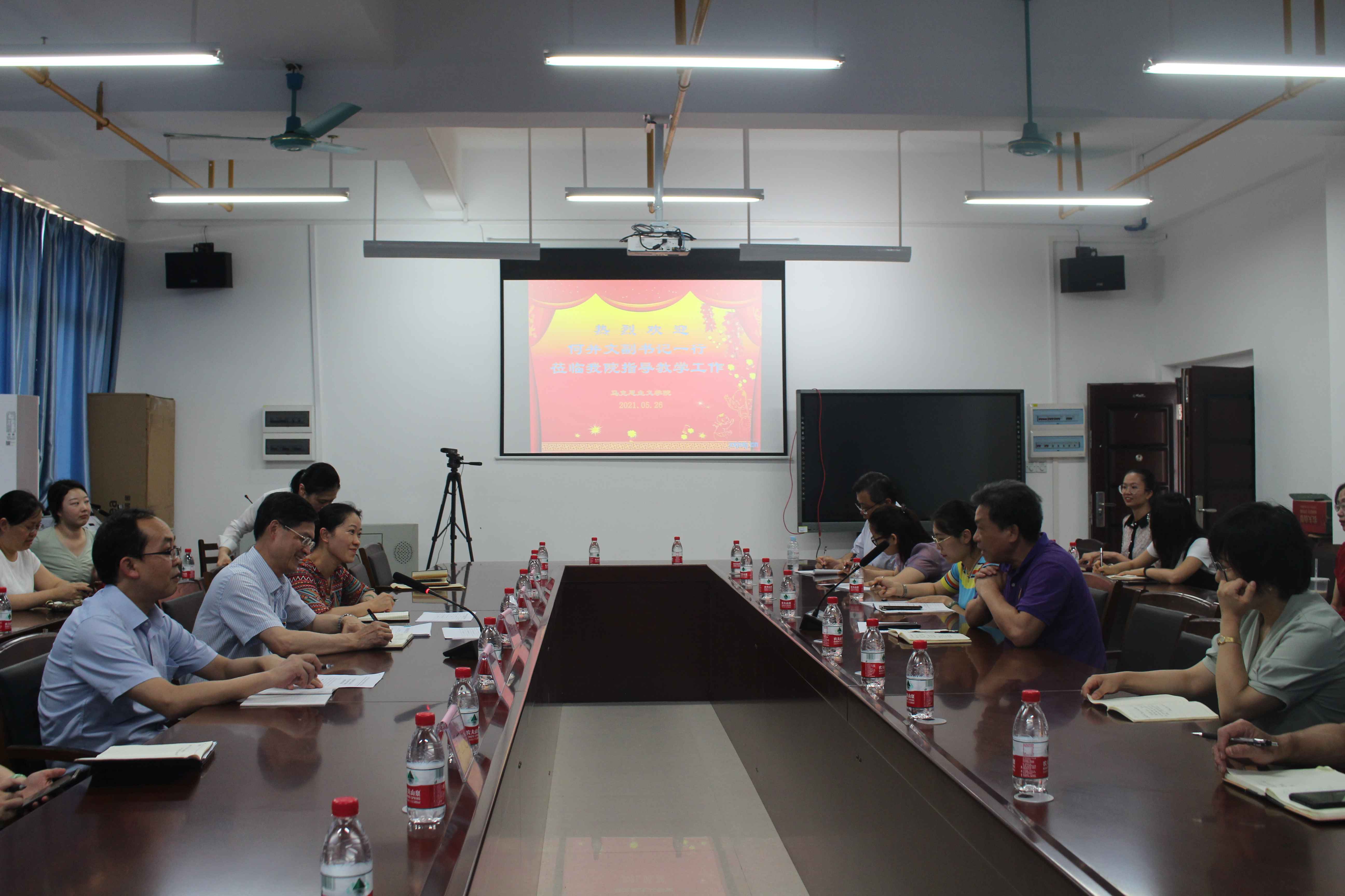 5 月 21 日 下 午,beat365官网党委 副 书记 何并文 带队到马克思主义学院(以下简称马院) 指导教学工作 ,就马院 的教学中期检查 工作 及 教学科研、学科建设等方面工作进行 检查指导 。并与马院全体教职员工座谈交流。 校 组织部部长唐振宇、教务处处长莫雪妮、学工处处长叶勇玲、学工处副处长曾淑文、教评中心蓝丽霞、李静 参加 会议, 会议由马院院长韦兆钧主持。