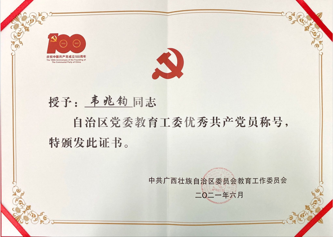 为表彰先进、树立典型,激励广大党员进一步增强“四个意识”、坚定“四个自信”、做到“两个维护”,践行立德树人初心使命,自治区党委教育工委在所属基层党组织和党员中,评选表彰一批优秀共产党员、优秀党务工作者、先进基层党组织(简称“两优一先”),我院党支部书记韦兆钧同志荣获“优秀共产党员”称号。