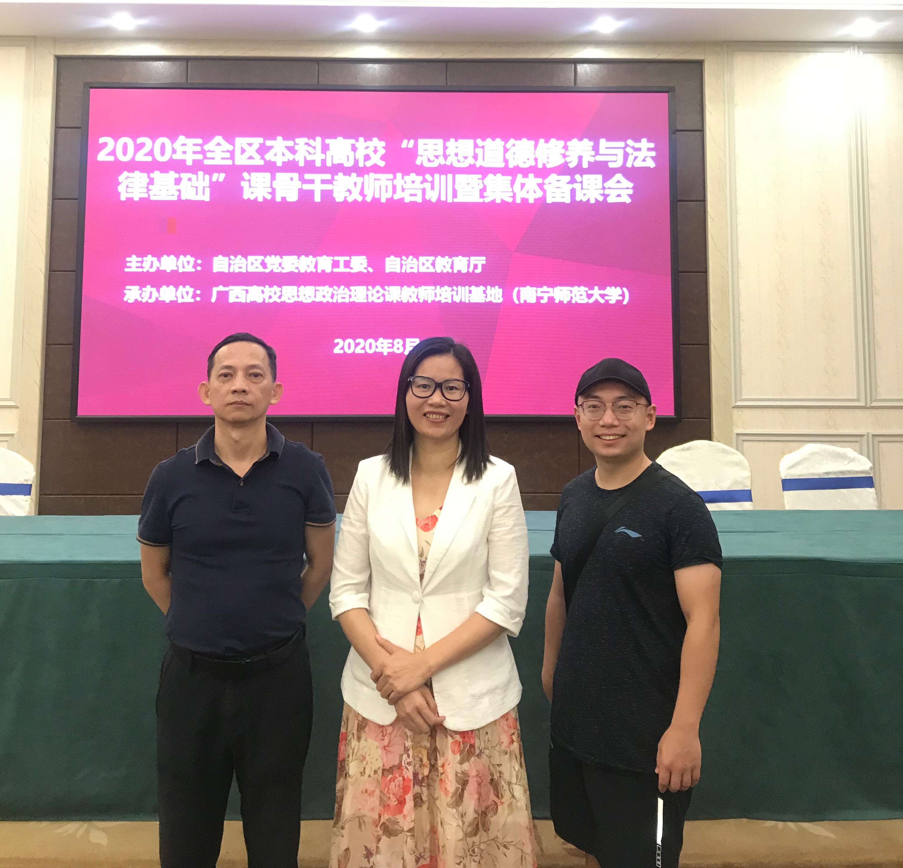 8月26日至30日,自治区教育工委、自治区教育厅主办,广西高校思想政治理论课教师培训基地(南宁师范大学)承办的2020年全区本科高校“思想道德修养与法律基础”课骨干教师培训暨集体备课会在桂林兴安如期开展,我院基础教研室颜维海、裴彧、谢锦荣三位教师参加了此次备课会。