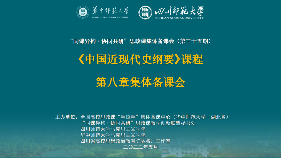 马克思主义学院中国近现代史纲要教研室以多样化形式开展集体备课,除本教研室的线下备课之外,还组织参加了线上集体备课会。5月29日上午,讲授“纲要”课的全体教师,在线上参加了“同课异构·协同共研”“纲要”课第八章集体备课会。本次集体备课会由全国高校思政课“手拉手”集体备课中心(华中师范大学)、“同课异构·协同共研”思政课教学创新联盟秘书处、四川师范大学马克思主义学院、四川省高校思想政治教育陈驰名师工作室和华中师范大学马克思主义学院共同主办,来自全国各地数十所高校的思政教师参与了本次备课会。