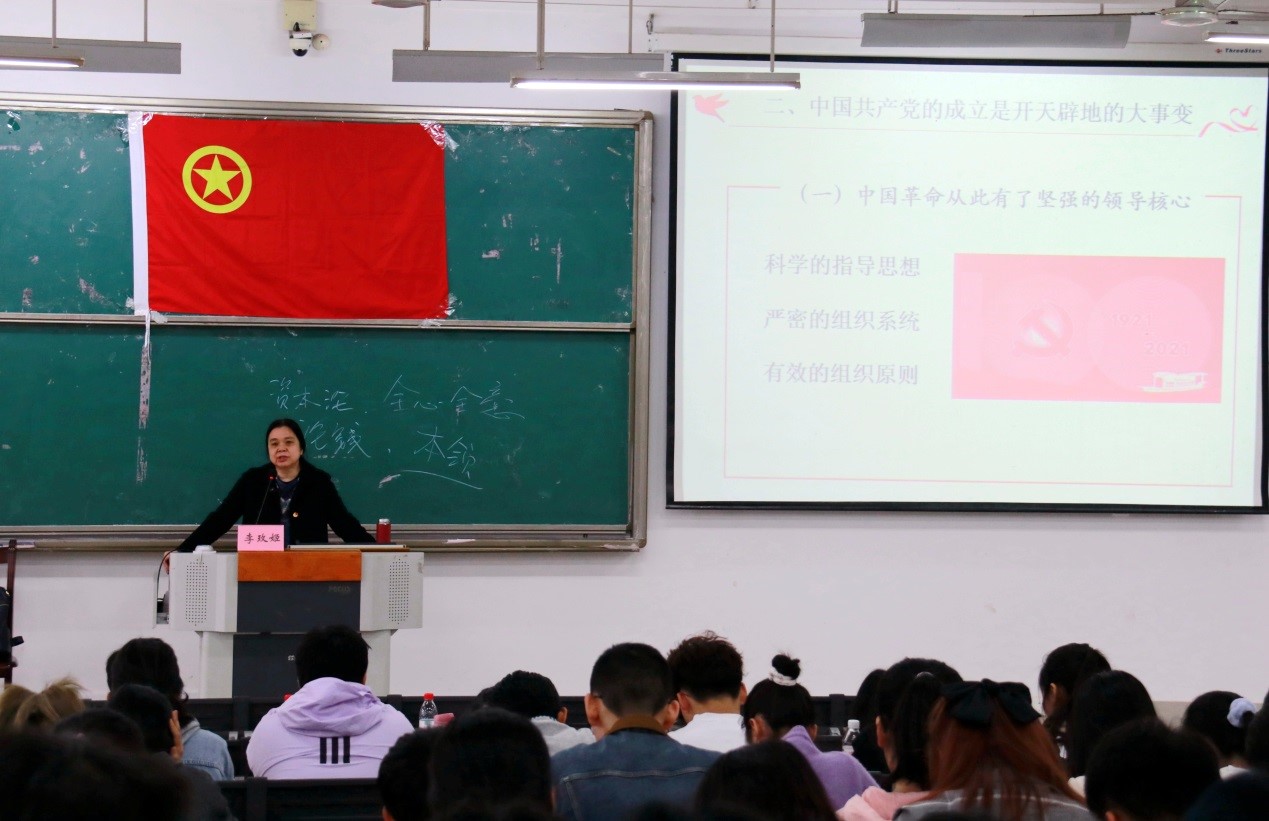 李玫姬教授给“青马工程”的学员们作了题为《开天辟地的大事变——中国共产党的成立》的专题理论辅导。李玫姬教授全面阐述了中国共产党成立的过程,并从中国革命有了坚强的领导核心,科学的理论指导,新的革命方法,以及革命面貌焕然一新等四个方面帮助学生理解中国共产党的成立是一件开天辟地大事变。李玫姬教授的理论辅导课既有理论的深度解读,又有案例的辅助引导,内容详实,使全体学员在重温中国共产党建党的历史中,深刻认知中国共产党成立的意义,从而进一步地坚定对中国共产党的信心,树立正确的政治立场。
