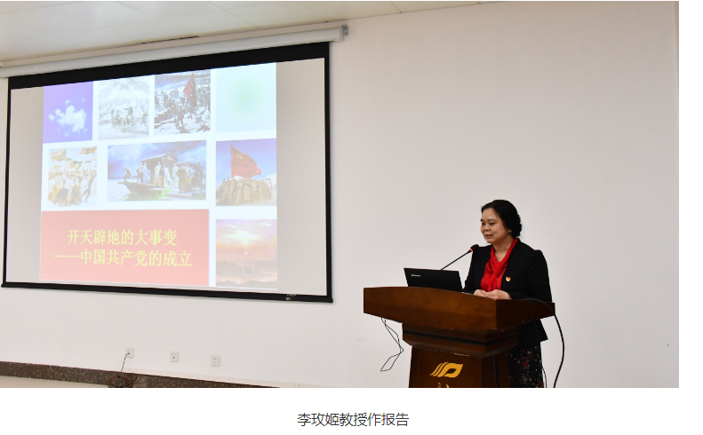 会上,还邀请马克思主义学院李玫姬教授给大家作了题为《开天辟地的大事变-中国共产党的成立》的专题辅导报告。