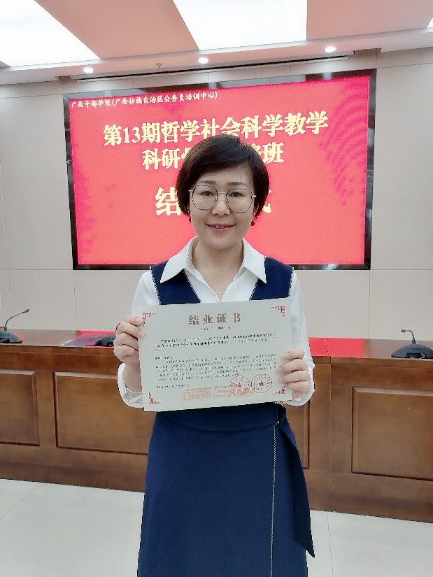 2021年4月19日-23日,自治区党委宣传部在广西干部学院举办了第13期哲学社会科学教学科研骨干研修班。本期研修班的宗旨是深入学习贯彻习近平新时代中国特色社会主义思想,扎实开展我区党史学习教育,并着力提升哲学社会科学教学科研人员素质,不断推动我区哲学社会科学繁荣发展。纲要教研室的贾静波老师和思修教研室的谢锦荣老师参加了本期研修班。