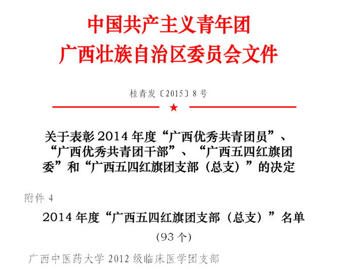 近日,从共青团广西区委办公室传来喜讯,我院临床医学团支部荣获2014年度“广西五四红旗团支部(总支)”称号。