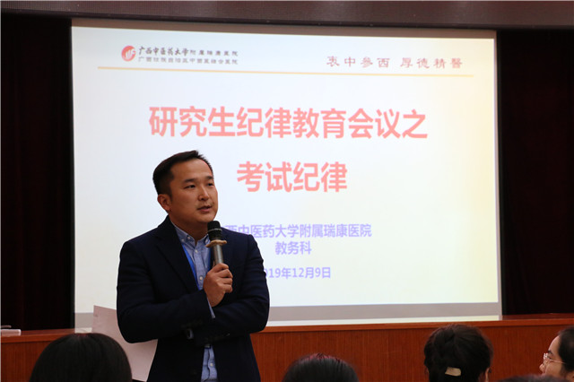 为加强研究生考试纪律教育,确保年度各类考试顺利进行。12月9日下午,瑞康临床医学院在B座10楼教室召开2019-2020学年研究生考试纪律教育大会,教务科科长汪国翔,教务科李建橡、莫基安以及我院2017级、2018级和2019级共445名研究生分两批参加会议。