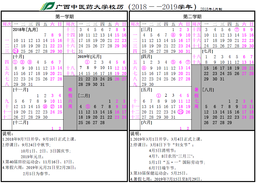 2018-2019学年校历