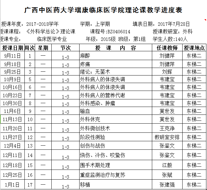 15级临床第1组《外科学总论》理论课表