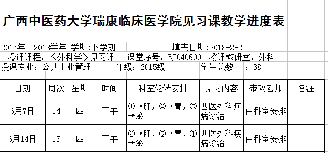 2017-2018下15级公共事业管理《外科学》见习进度表