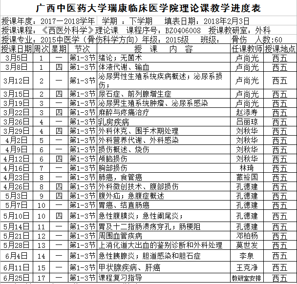 2017~2018下15级中医骨伤专业《西医外科学》理论课进度表