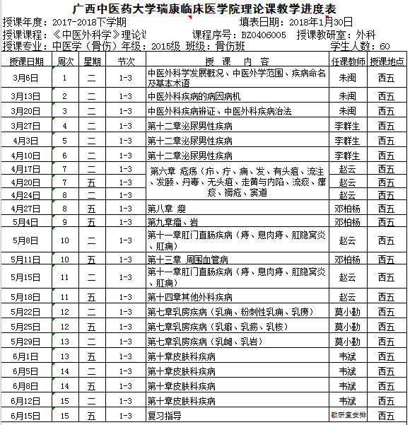 2017~2018下15级中医骨伤专业《中医外科学》理论课进度表