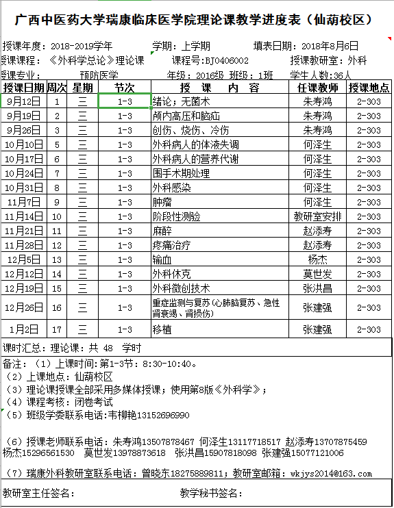 2016预防医学1班《外科学总论》理论课表