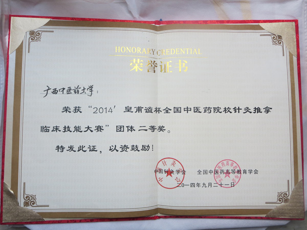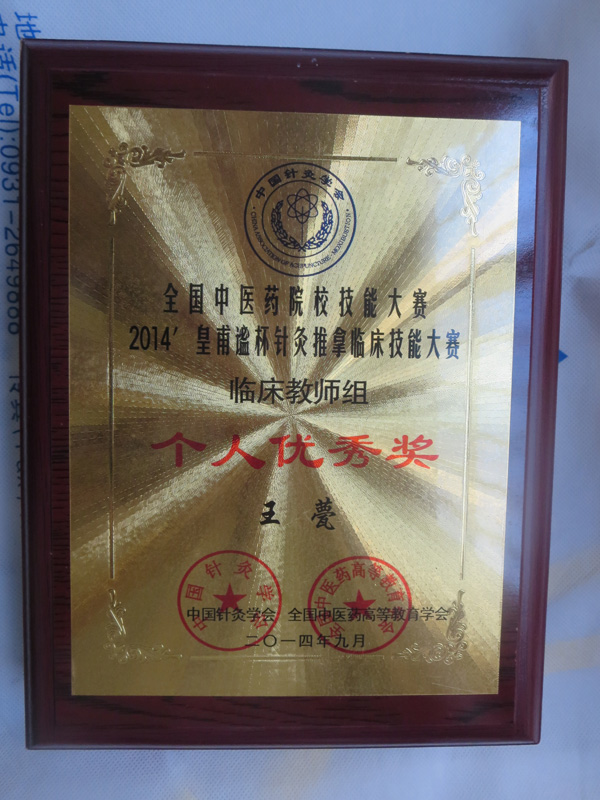 我院王甍老师代表beat365正版唯一入口必一荣获2014年度“皇甫谧杯”全国中医药院校针灸推拿临床技能大赛团体二等奖及临床教师组优秀奖