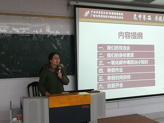 同时,我院在寒假和春节前进行考试巡考和安全教育及宿舍检查,旨在落实学生管理工作,力争使学生工作更全面、深入、到位。1月13至20日,我院学生科对各专业班级进行了寒假安全教育主题班会,强调出行安全,人身财产安全和食品安全等问题,进一步加强了学生的安全意识。1月10至16日,我院学生科组织辅导员老师对校内各宿舍以及南宁市各实习医院宿舍进行走访及安全排查,辅导员老师与同学们充分讨论当前实习、就业中遇到的问题,并对同学们用电安全、宿舍卫生等作出要求。