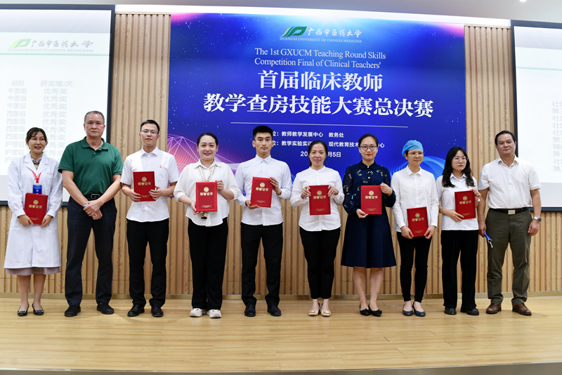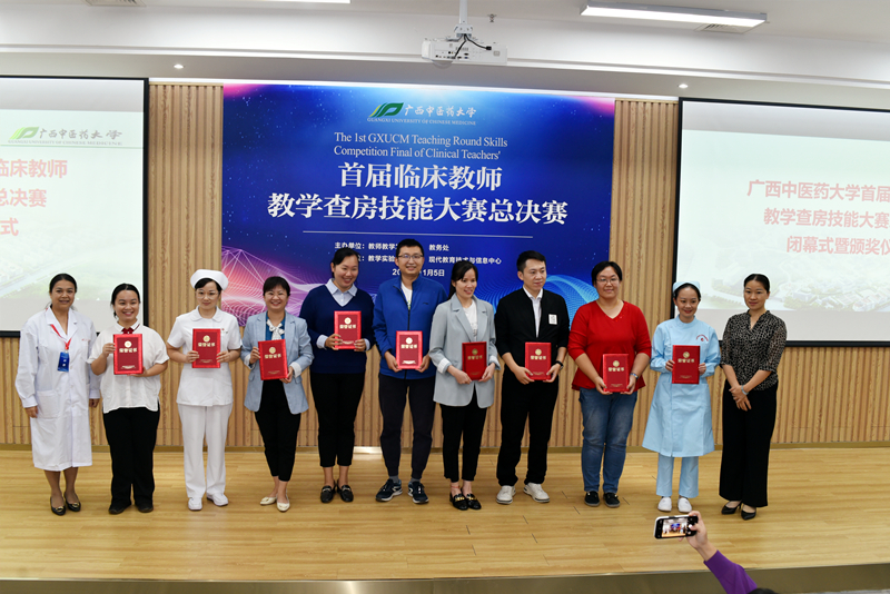 总决赛上,我院中医组、西医组及护理组共9支代表队与第一临床医学院、壮医临床医学院、第三临床医学院(柳州市中医医院)的22支队伍同台竞技。经过一天的激烈角逐,我院斩获一等奖2个(儿科赵敏芳、手术麻醉科廖华)、二等奖4个(产科刘卓、妇科一区韦林、胃肠外科高丕尧、消化内科二区庞春)、三等奖2个(中医经典病房冯原、胸心血管外科韦乐乐)、优秀奖1个(神经内科二区欧俐羽)及优秀组织奖1个,其中我院中医组及护理组代表队包揽总决赛第一名。