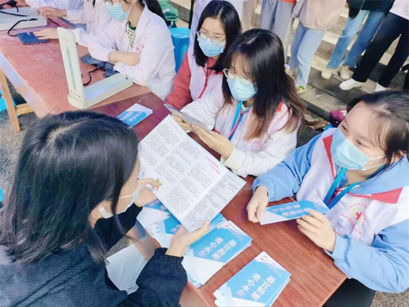 下午三点,义诊队伍顺利抵达目的地,井然有序完成了相关准备工作。伴着细雨,朝气蓬勃的志愿者们怀着饱满的服务热情开始工作,负责宣传的志愿者手拿健康知识宣传册,向路过的同学、老师们科普健康知识,宣讲健康生活态度;负责健康义诊的志愿者则身披白大褂,他们有的在为老人们测量血压,一边耐心叮嘱他们养成良好的生活习惯,一边引导他们树立防护意识;有的在为老师同学们进行手法按摩,娴熟精巧的手法赢得一众称赞。