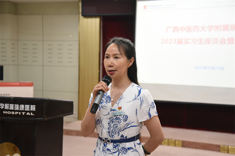 陈日兰副书记首先对2023届医学类实习生顺利完成实习表示祝贺,对他们在疫情期间能够坚守岗位给予充分肯定,并表示感谢。随后她对实习生们的就业目标和职业规划给出了建议和指导,并提出四点希望:一是与新生做好交接,传承好瑞康精神;二是不忘初心、牢记使命,努力成为一名掌握扎实三基知识、拥有良好科研素养、为人民健康服务的合格医学人才;三是精益求精,刻苦钻研,虚心求教,学习先进,始终坚持练就为人民服务的本领;四是保持联系、加强沟通,瑞康医院是大家坚强的后盾,永远的家。