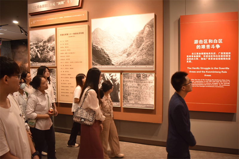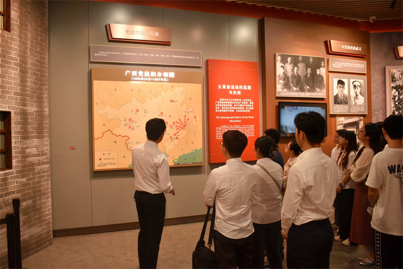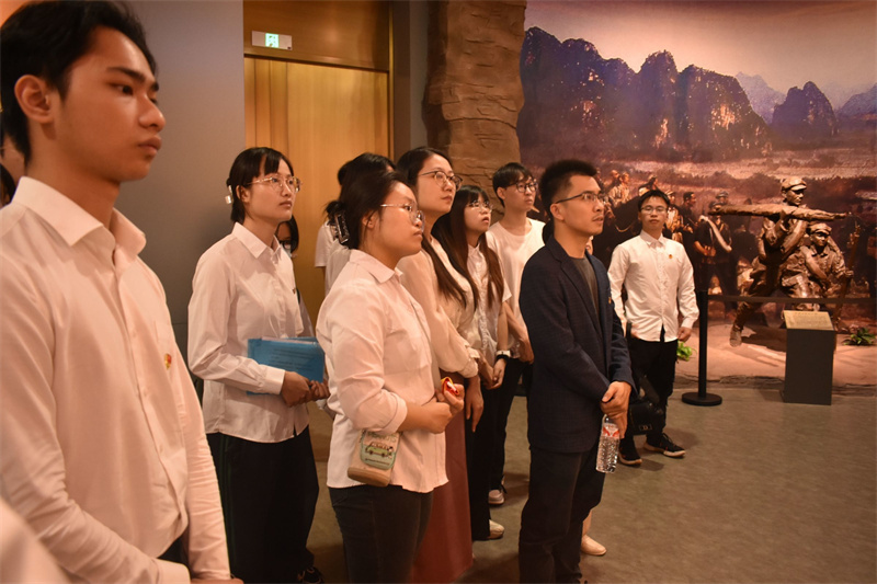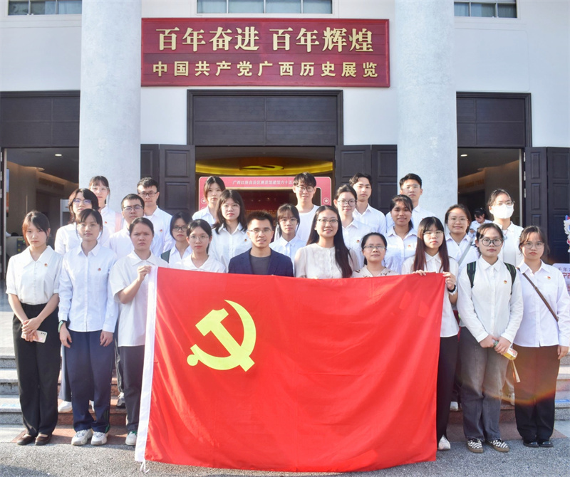 抚今追昔,于百年党史中汲取奋进力量。怀着崇敬的心情,参加活动的全体师生跟随解说员的脚步,沿着中华民族从站起来、富起来、再到强起来的历史脉络中学习中国共产党波澜壮阔的百年历程,参观了“奋进新时代”主题成就展广西单元,从“烽火南疆”“巨变壮乡”“潮涌八桂”“壮美广西”四个展厅中,深入了解中国共产党带领广西各族人民不懈奋斗的伟大历程和广西在脱贫攻坚战中取得的伟大成就,深切感受中国共产党为中国人民谋幸福、为中华民族谋复兴的初心与使命。