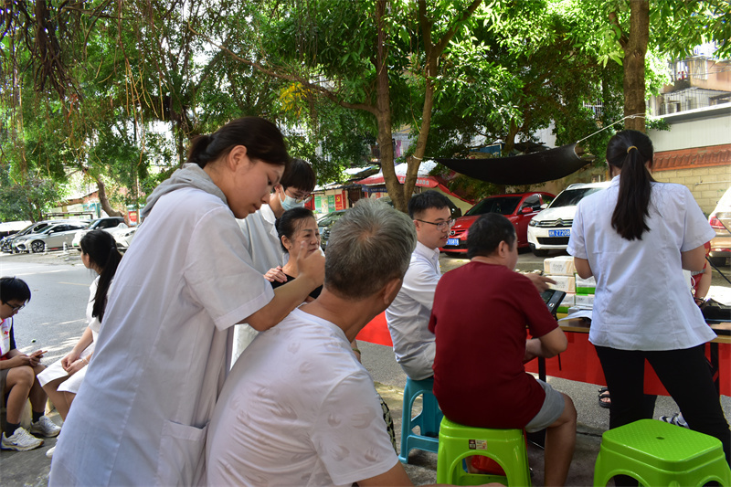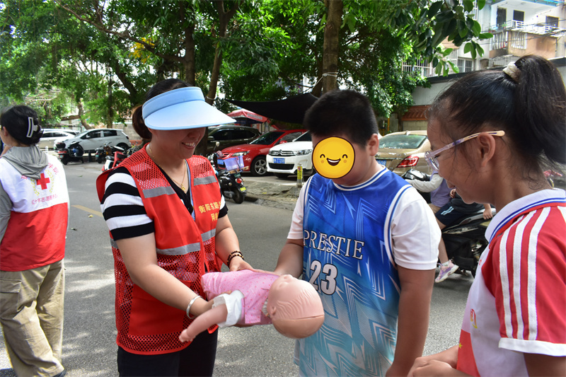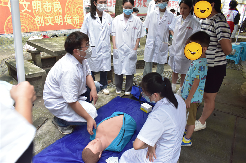 活动伊始,志愿者们有序地布置现场,吸引了许多居民前来咨询。活动中,志愿者们身穿统一红马甲耐心地为居民们测量血压、手法按摩、艾灸等,同时还科普基本急救知识,一对一地讲解了成人心肺复苏和婴儿海姆立克急救法的具体步骤,并邀请居民们进行现场操作。